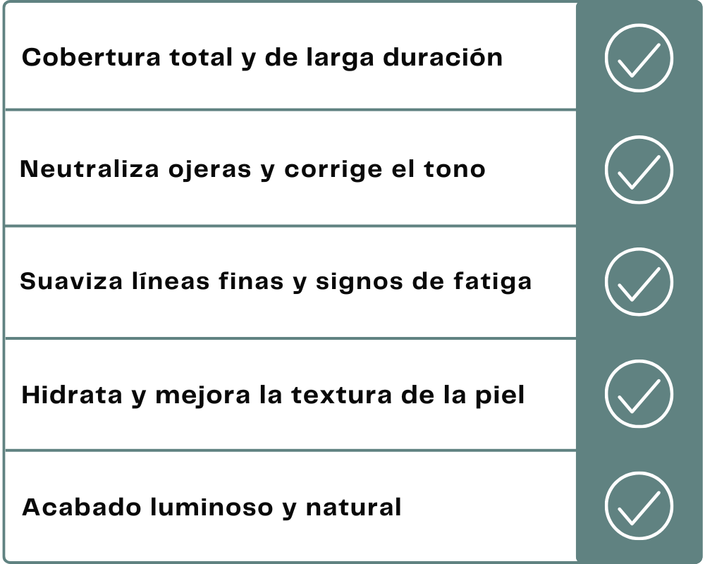 Su textura cremosa y ligera se difumina fácilmente, dejando un acabado natural, suave y sin pliegues. Se siente cómodo, hidratante y flexible durante todo el día, ideal para lograr una mirada fresca, uniforme y radiante.