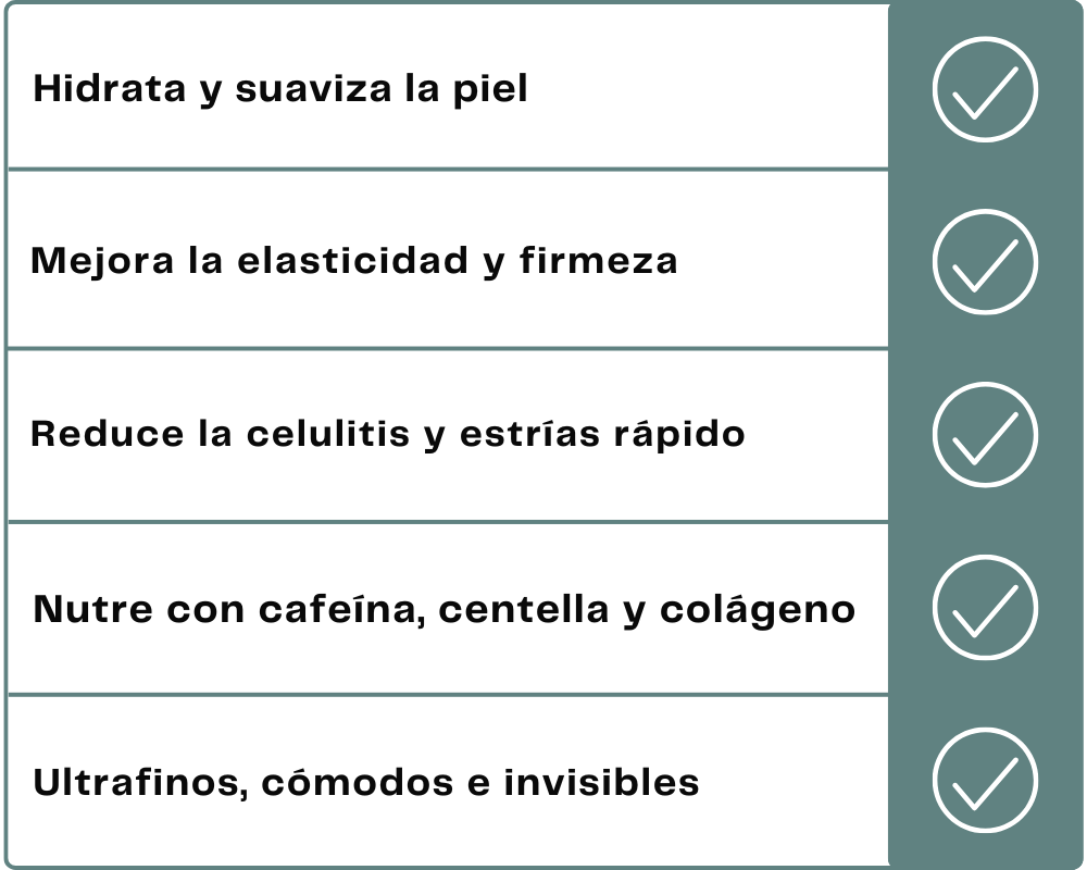 Con tecnología de liberación prolongada e ingredientes activos de acción reafirmante, ayudan a mejorar la textura de la piel, estimular la elasticidad y devolverle un aspecto saludable y sedoso. Invisibles bajo la ropa, acompañan tu día sin incomodidad ni irritación, potenciando resultados de forma práctica y discreta.