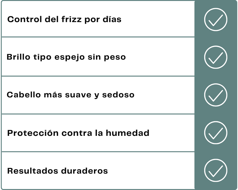Desde el primer uso notarás el cabello más suave, brillante y con menos frizz. Con aplicaciones regulares, el efecto protector y de brillo se intensifica, manteniendo el cabello manejable y sin encrespamiento por más tiempo.